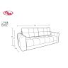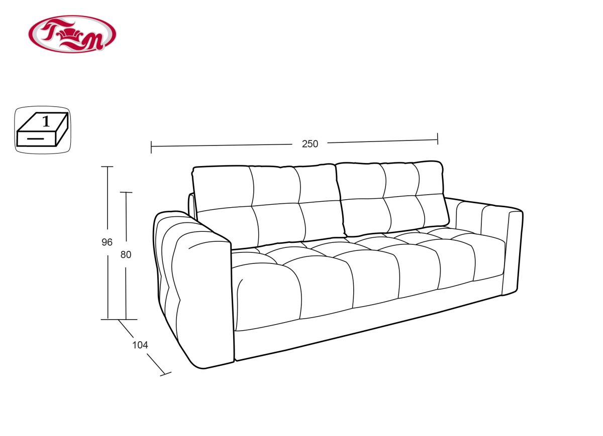 250 х 104, h80 см. по спинке, h96 см. по подушкам, h посадочного места 47 см.