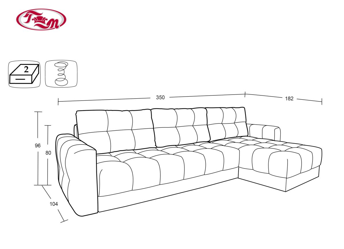 Габаритные размеры: 350 х 182, h80 см. по спинке, h96 см. по подушкам, h посадочного места 47 см.