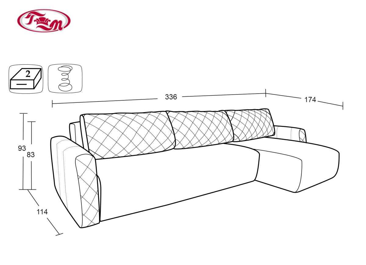 Габаритные размеры: 336 х 174, h83 см. по спинке, h93 см. по подушкам, h посадочного места 46 см.