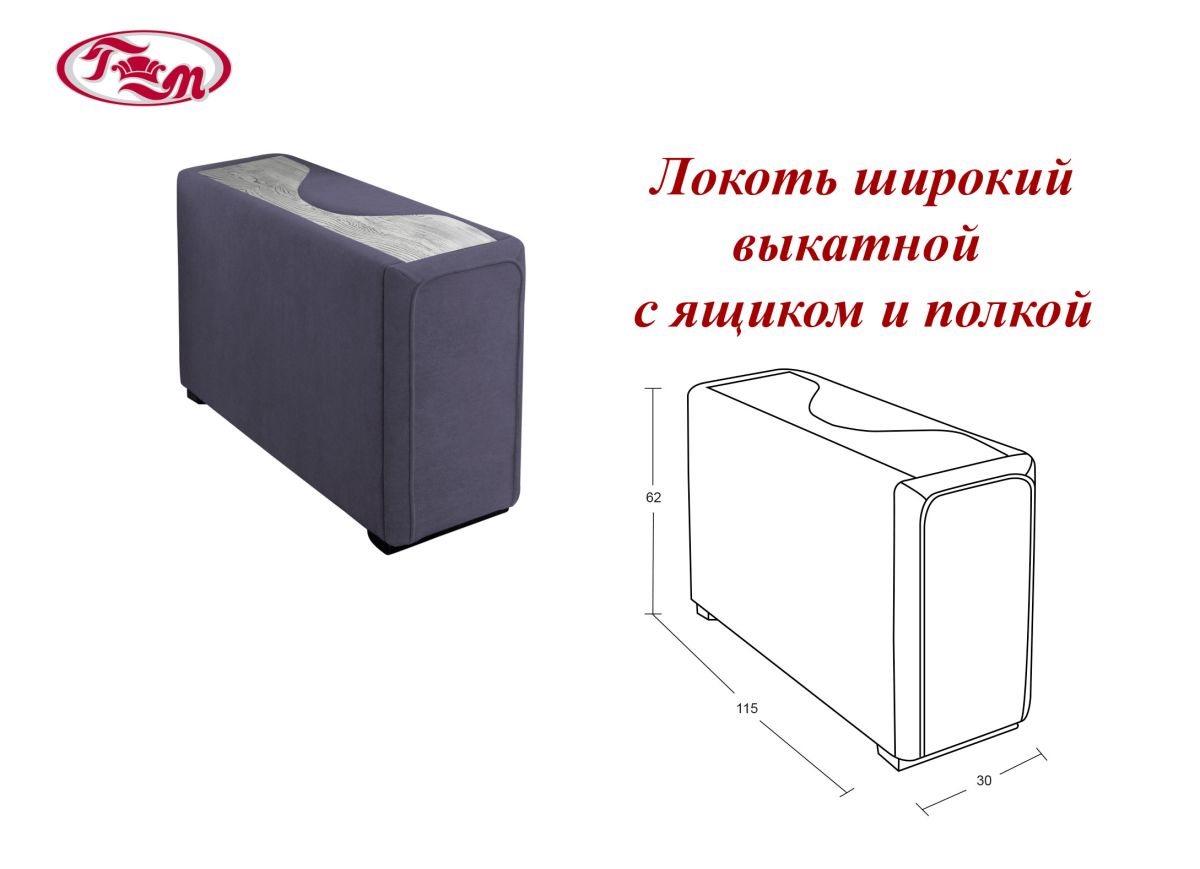Доп. описание: декор на широком подлокотнике — натуральное дерево, широкий подлокотник выкатной с ящиком и полкой. При заказе отдельного модуля, при облагораживании бочков, ширина каждого модуля (кроме подлокотников и пуфа) увеличивается на 3 см.