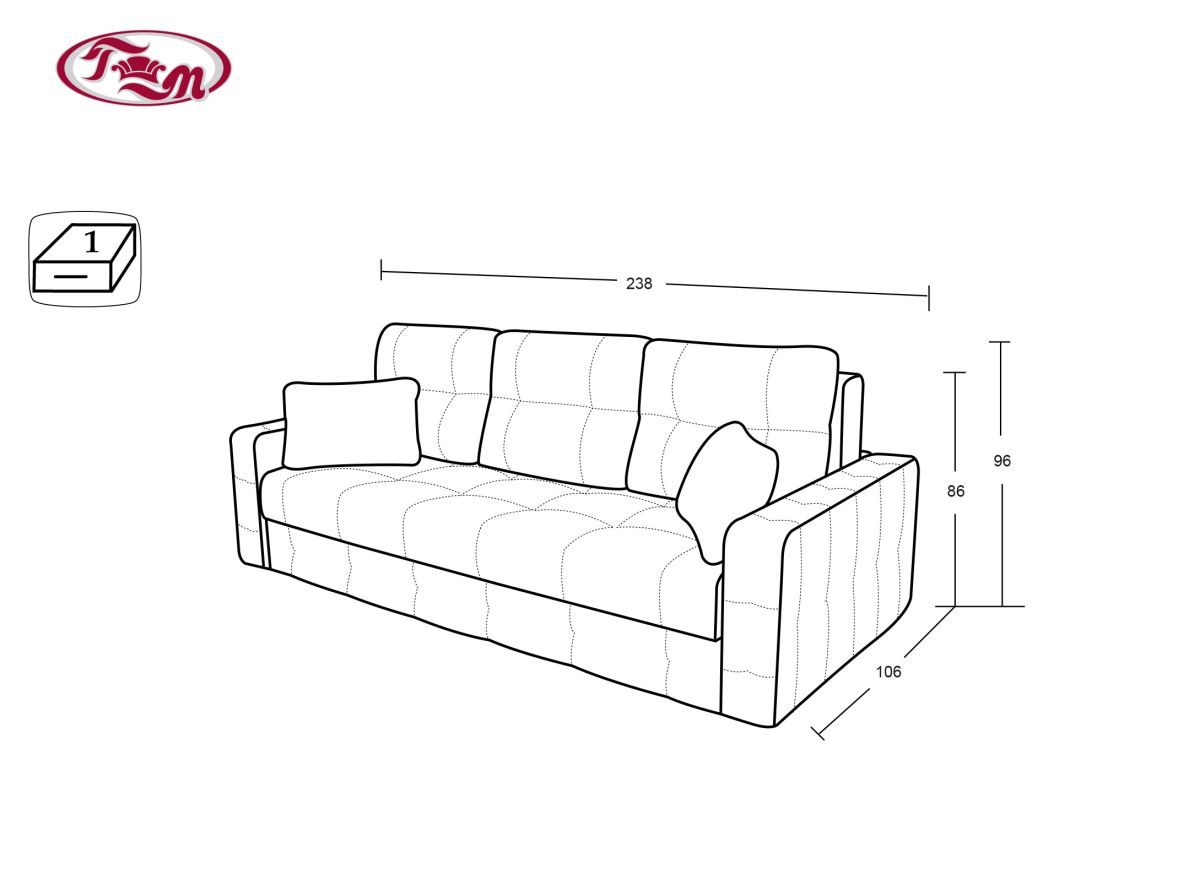 Габаритные размеры: 238х106, h86 по спинке, h96 по подушкам