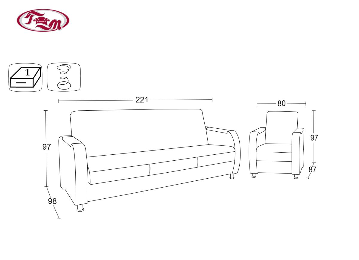 Габаритные размеры дивана: 221х98, h97 см.