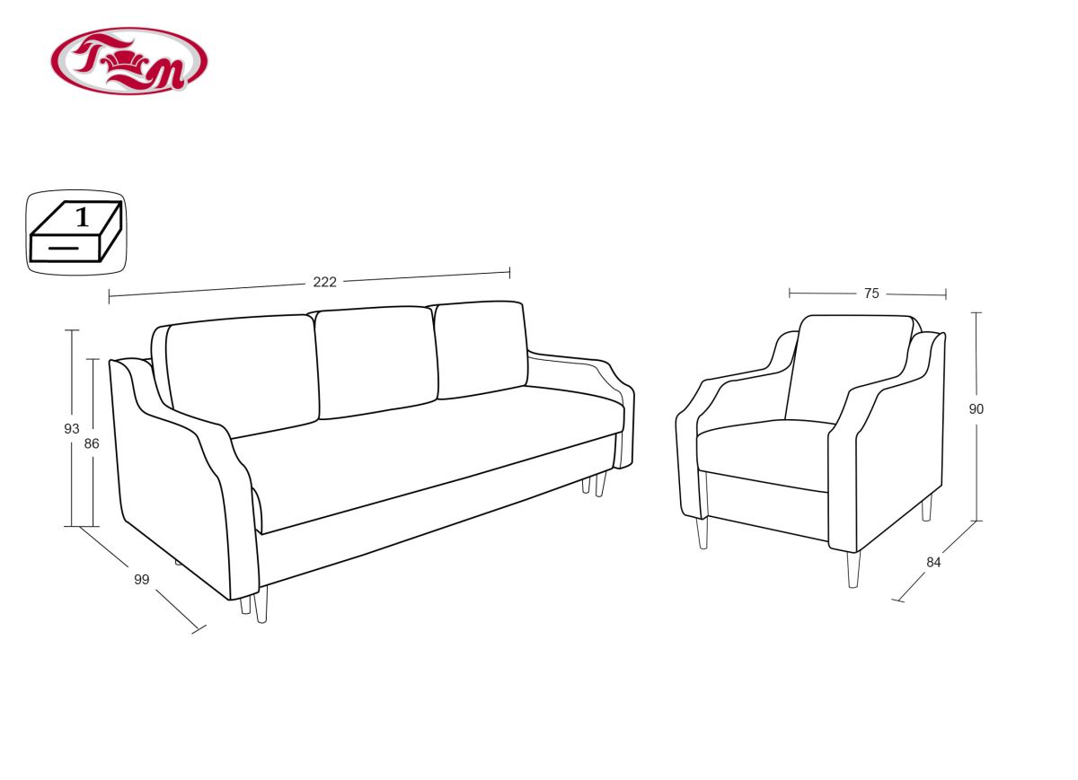 Габаритные размеры дивана: 222х99, h86 по спинке, h93 по подушкам, h ножки 15 см.