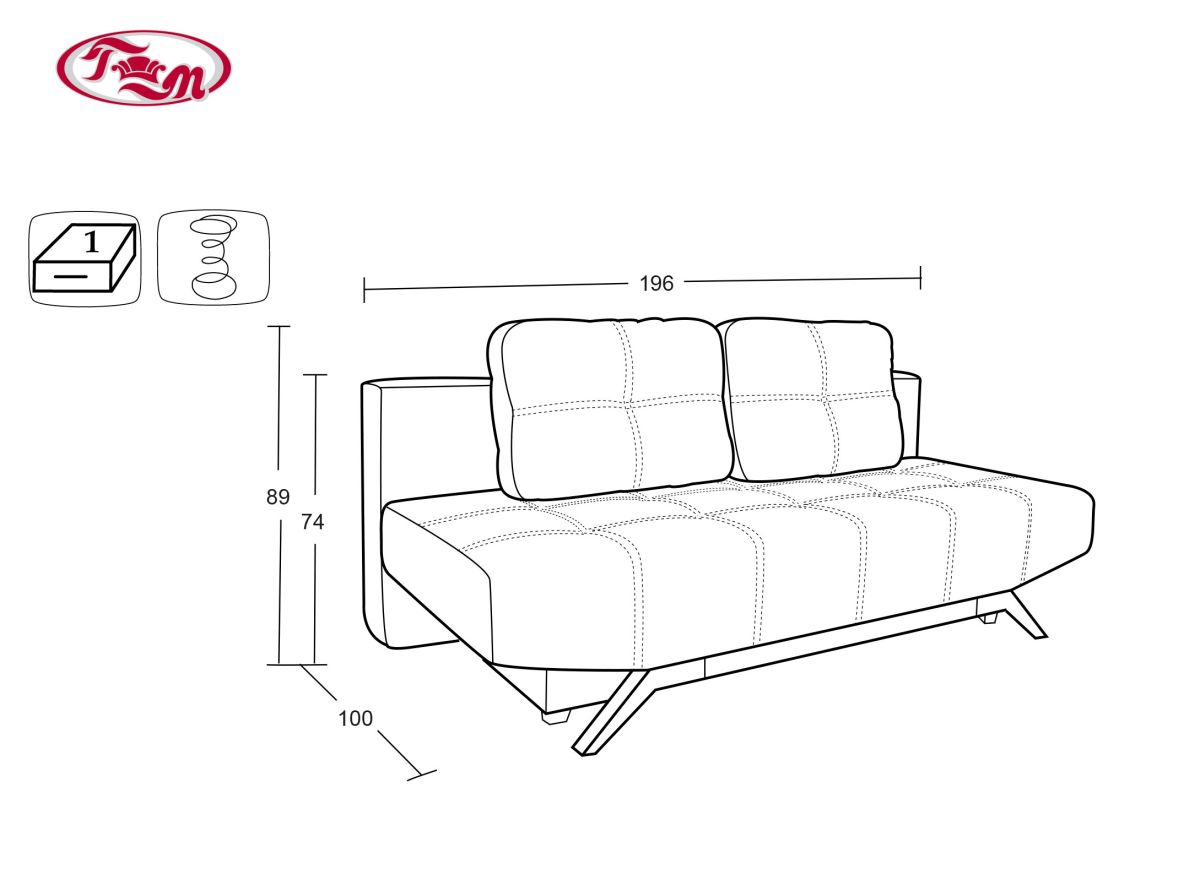 Габаритные размеры: 196 х 100, h74 см. по спинке, h89 см. по подушкам, h посадочного места 45 см.