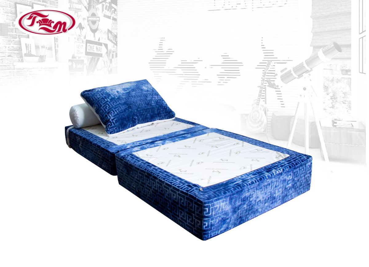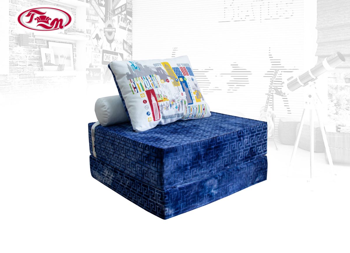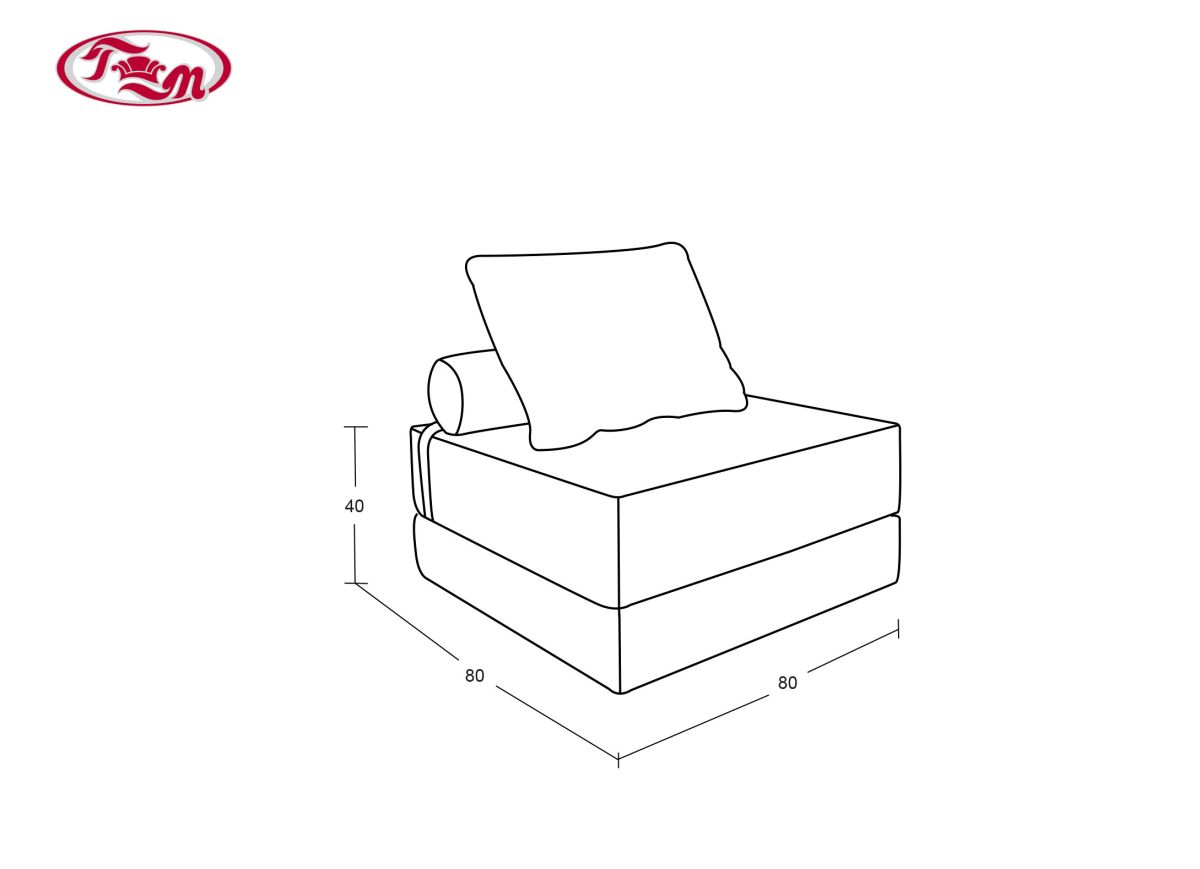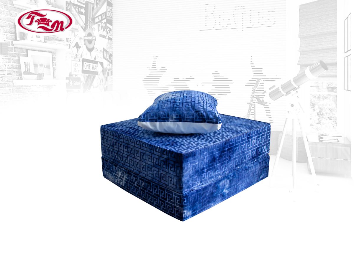 Доп. описание: пуф декорирован подушками, подушка-валик фиксируется с помощью ремешка. В разложенном виде пуф образует спальное место размером 160 х 80 см.