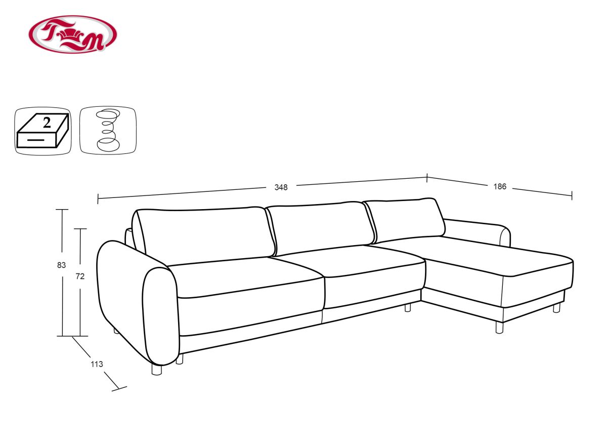 Габаритные размеры: 348 х 186, h72 см. по спинке, h83 см. по подушкам, h посадочного места 46 см.