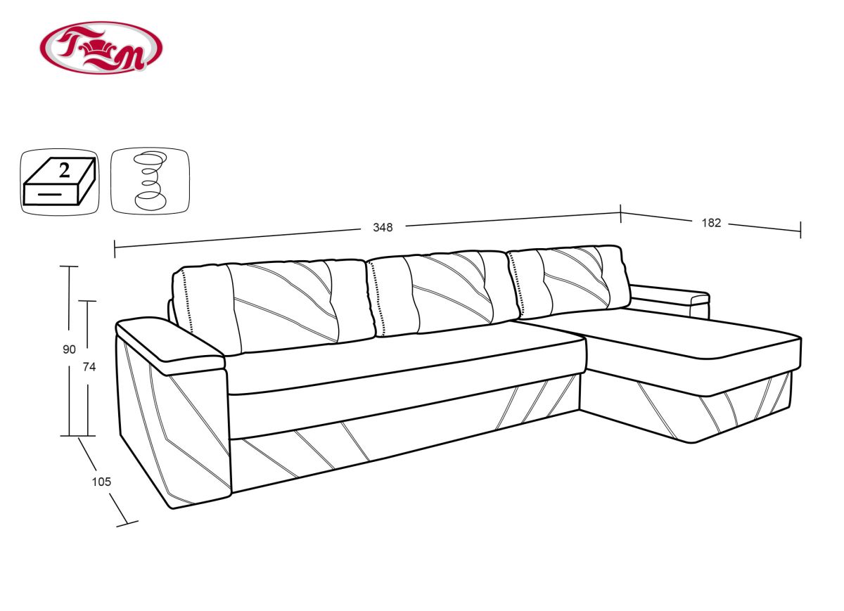 Габаритные размеры: 348х182, h74 по спинке, h90 по подушкам; h посадочного места 47 см.