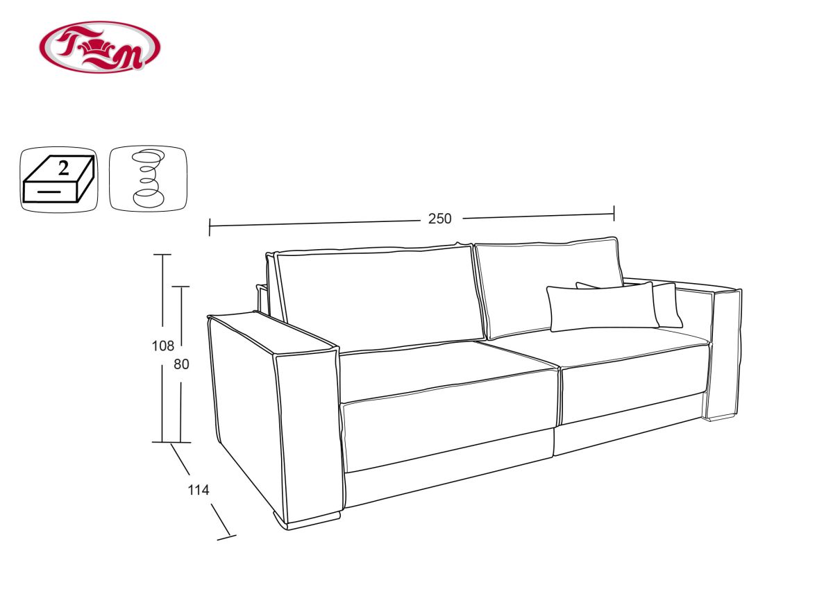 Габаритные размеры: 250 х 114, h80 см. по спинке, h108 см. по подушкам, h посадочного места 48 см.