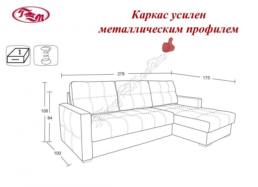 Доп. описание: для дополнительной гарантии надежности в повседневной эксплуатации каркас сидения и спального места выполнен из металлического профиля. Ножки дивана изготовлены из натурального дерева.